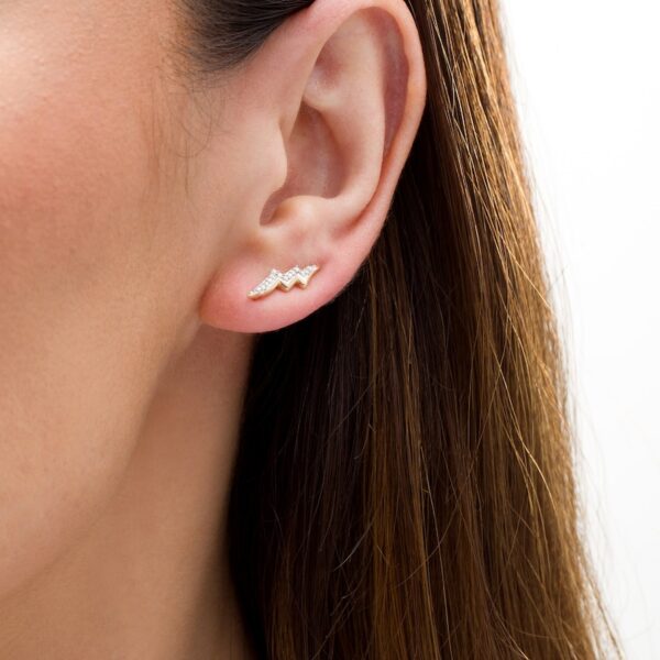 Fearless and daring, these diamond crawler earrings bring your adventurous side to the forefront. Fashioned in warm 10K gold, each electrifying earring showcases a diamond-lined lightning bolt highlighted by a polished ribbon. Radiant with 1/8 ct. t.w. of diamonds and a brilliant buffed luster, these earrings secure with long wire backs that stabilize the climbing design. This exclusive fine jewelry collection inspires you to wear your strength, confidence and power.